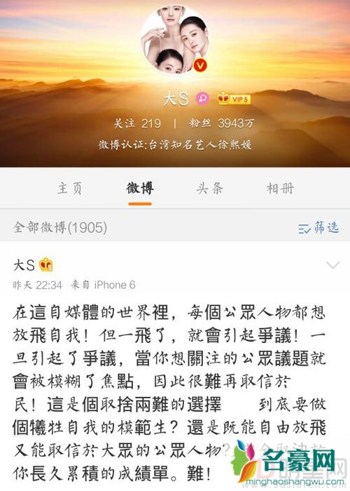 2月21日晚,大s在微博上发文感叹公众人物放飞自我,表示:“在这自媒体的世界里,每个公众人物都想放飞自我!但一飞了,就会引起争议!一旦引起了争议,当你想关注的公众议题就会被模煳了焦点,因此很难再取信于民!这是个取舍两难的选择?到底要做个牺牲自我的模范生?还是既能自由放飞又能取信于大众的公众人物?完全取决于你长久累积的成绩单。难!”她的这番感叹或许是自己有感而发,但不少网友认定这段话疑指郑爽小号这几天活跃频繁的事件。