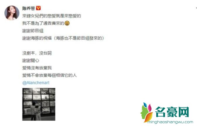 近日,陈乔恩在社交平台上澄清了此事,陈乔恩晒出了一张与艾伦的甜蜜照片,并且表示,“来录《女儿们的恋爱》就是来恋爱的,我不是为了通告费来的,谢谢节目组,谢谢海豚的祝福”,最后更是强调节目没有剧本,爱情没有放弃我,爱情不会放弃每个相信他的人”。