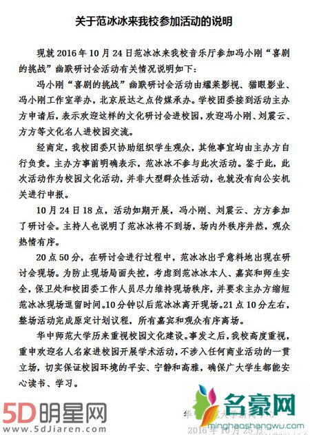 范冰冰主演的电影《我不是潘金莲》日前在华中师范大学进行路演宣传,当天由于原定计划是由冯小刚、范冰冰以及当地的知名作家方方一起出席和同学们一起讨论喜剧以及电影的问题。结果在活动进行到十分钟之后,范冰冰被突然要求离场,否则以断电相威胁,随后该活动在大家的紧张不安中草草收场。而随后,不少人为范冰冰打抱不平,受到指责的华中师范大学也在第二天作出回应,称所有的问题都是主办方和艺人沟通,学校只负责提供场地,而原本得到的消息是范冰冰并不在名单之内,为了保证学生们的安全,因此要求范冰冰离场。该校的老师也在微博上澄清这件事并不存在阴谋论,也不是为了针对某位艺人。