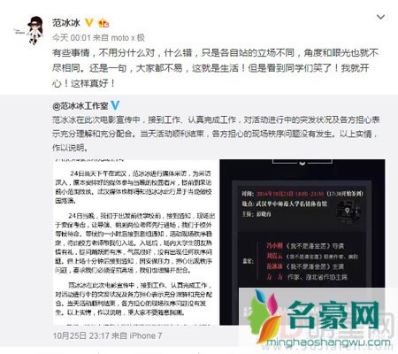 在校方作出回应之后,范冰冰工作室也就此事再次进行回应,解释称当天原本是和范冰冰在场外待命,在得知现场秩序良好的情况下才进场,而现场的同学们和大家也都表现的非常配合,并未发生什么冲突和大事件,却在没多久就要求范冰冰离开并不给出任何理由让人感到莫名其妙。虽然双方各有各的道理,但是事情已经发生且造成了一定的不愉快,这件事也终须一个了解。今天上午,范冰冰转发工作室微博并写到“不分对错,立场不同”解释这件事的背后并没有什么大不了的,也算是告一段落。