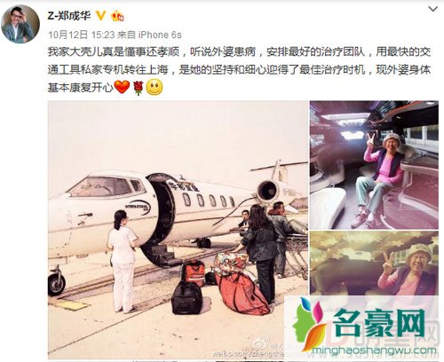 由于郑爽没有微博的缘故,所以那些想要关注爽妹子最新动态的网友,大家少不了会关注一下郑爽爸爸郑成华的微博,12日郑成华在微博中晒出九宫格照片,并大赞女儿懂事孝顺,“听说外婆患病,安排最好的治疗团队,用最快的交通工具私家专机转往上海,是她的坚持和细心迎得了最佳治疗时机,现外婆身体基本康复开心。”从爽爸晒出的照片我们可以看到私人飞机及豪华座驾,里面空间宽敞、设施齐备。看到这里大多数网友都觉得郑爽的孝心值得褒奖,虽然也有一小部分网友批其炫富,但花自己赚的钱尽孝也没什么错吧。