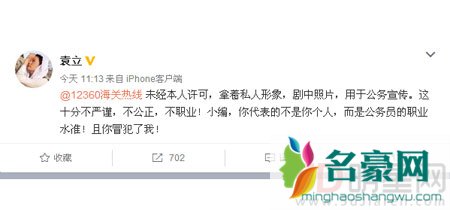 一篇原本无关紧要的微博,一夜之间受到两大官方媒体的转发批评,于是各大媒体纷纷报道此事,袁立在今天得知此消息后也第一时间对此进行回应,从早上七点多开始,首先反驳了团中央的批评,认为只是艺术形式的表现,至于如何评价则需要交给观众,到了九点多,袁立再次发博对海关回应“拿着剧照示众,不职业不严谨不公正,不像政府部门的职业水准”。相关部门一直未正面回应之后,袁立也接二连三的发出认为海关在未经本人许可情况下借由本人照片进行教育及宣传是对袁立的冒犯,同时指责对方是公务员形象更应该谨慎,而对该作品是否应上升到政治层面则是广电的事情不应由海关和团中央决定。