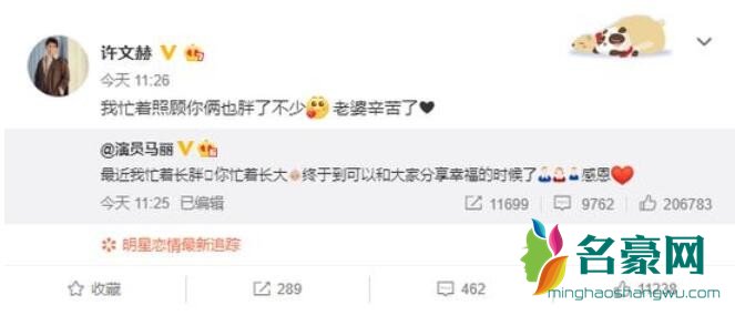 近日,马丽在社交平台上更新了一条动态,马丽发布喜讯表示:“最近我忙着长胖,你忙着长大,终于到可以和大家分享幸福的时候了,感恩”。随后,许文赫也转发了该条微博称:“我忙着照顾你俩也胖了不少,老婆辛苦了”。
