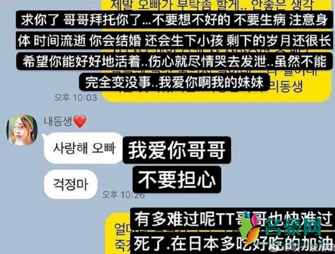 晒出的聊天记录中,可以完全感受到他们两个焦虑的对话,哥哥恳切地希望具荷拉可以抛弃不好的想法:“哥哥拜托你了…不要再想一些不好的想法了,不要再受伤了,好好照顾健康,随着时间的流逝,结婚生子,剩下的人生能幸福的度过就好了…我爱你,我的妹妹”