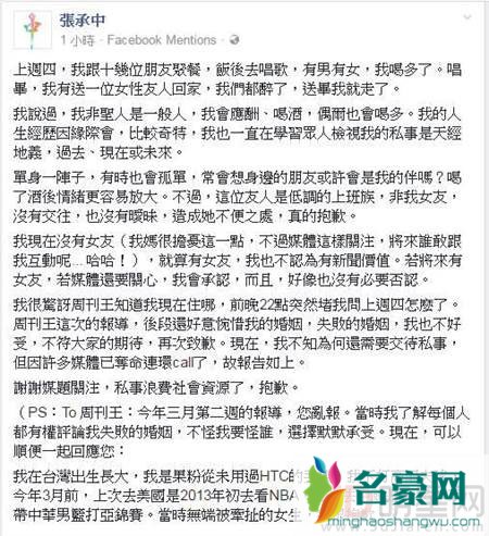 据张承中所说,上周四是和一群朋友一起聚餐喝酒唱歌,结束之后自己送一位女性朋友回家,因为两人都已经醉了,所以当时也会有感而发,会认为对方会不会就是自己另一半。自己只是一般人,喝醉酒后也孤单,情绪被放大,不过也否认该女生是自己的新女友,没有交往也没有暧昧,造成不便真的抱歉。张承中说自己不明白为什么到现在还会需要向媒体报告自己的新动向,不过,以后要是真的有恋情了会选择承认。