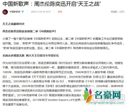 《中国新歌声》第一季虽然刚刚过去,但第二季《中国好声音》已经开始紧锣密鼓的筹备当中,日前“新歌声”节目组率先公布两位导师人选,周杰伦将继续为他的地表最强战队争夺成员,“歌神”陈奕迅宣布全新加盟,这一新消息着实令《中国新歌声2》未播先火,话题攀升。