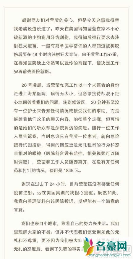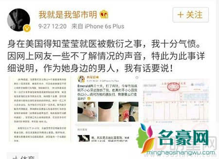 昨天中午,邹市明转发了妻子冉莹颖一篇微博,之后义正言辞的谴责因为冉莹颖被家中的宠物咬伤之后前往医院打疫苗,但是没有遇到医务人员的合理对待且在还没有打疫苗的情况下已经花费巨额医疗费,这也让冉莹颖大为生气。邹市明远在美国,得知妻子受到这样的委屈也发声想要为妻子讨回一个公道,对于一个普通家庭来说,只是单纯的打一个疫苗而已,为什么要收取这么高的费用暂且不说,护士的态度又为何如此的高傲,难道病人就不应该享受到正常的对待吗?邹市明希望有关部门能够合理改善这种让前往医院的人都能受到更好的对待,也让这种不正之风得到整治。