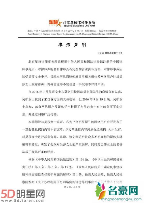 律师声明中表示部分网络媒体凭空杜撰了吴莎有关的负面不实消息,其内容不实、纯属捏造虚构、无中生有,对吴莎的名誉造成了极其严重的贬损,对此勒令删除对吴莎的一切不实信息,并向吴莎公开道歉,而吴莎方将保留追究侵权行为人的法律责任权利。随后刘翔转发该声明,力挺女友霸气回应:“有事冲我来!”