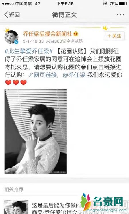 三天前,突如其来的噩耗让无数乔任梁的粉丝感到伤心不已,这个一直都保持着大大的微笑的男孩因为抑郁症而自杀身亡。网上各种传言和流言蜚语席卷而来的时候,乔任梁早已悄然离开这个人世,今天上去其经纪公司发微博宣布乔任梁追思会时间已定,将会在三天后以粉色主题送他最后一程,也希望所有喜欢他的人们届时参加。