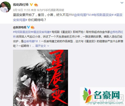 9月18日上午,知名编剧“柴鸡蛋”在微博上发布首款《星辰变》的概念海报,引发不少网友们的热议,原来这部由著名网络作家“我吃西红柿”所著的网络小说《星辰变》马上就要改编成电视剧了,而担任该剧编剧一职的就是曾经做过人气网剧小说《上瘾》的编剧柴鸡蛋。