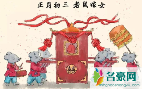 老鼠娶亲也叫老鼠嫁女、鼠纳妇,这一个很古老的传统民间传说,相传正月初三晚上是“老鼠娶亲”的大日子,人们会举行祀鼠活动。不过也有的地区是有的正月初七、正月初二,还有的是正月初十,也有的是夏历正月十四的夜半。江南一带民间传说中,老鼠是害人的不吉的,所以必须在大年初三十晚上出嫁,以保来年平安吉祥。 上海郊区的一些地方说,老鼠嫁女在农历正月十六日娶,那天晚上,家家都炸了芝麻糖,这是老鼠结婚的喜糖。