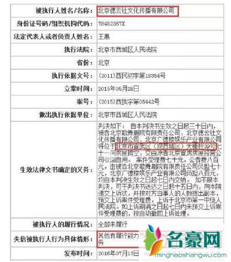 据悉,早在2011年期间,德云社其中一家演出场地广德楼的业主就有心收回自己的产业进行其他用途,但是德云社拒不执行。2012年,法院已经下达命令,直到2015年,德云社依然没有腾出广德楼导致法院下达强制执行传票但是依然没有效果。于是在今年的7月份德云社已经成为失信被执行人,由于此前媒体一直没有注意过所以这件事情也一直没有被曝出。前几天,郭德纲重修家谱,并再次逼迫曹云金、何云伟二人使得曹云金彻底爆发揭露郭德纲的恶行,也让民众的目光再次被聚集到郭德纲和其创办的德云社上,也在法院的官方网页上看到了这条令人震惊的消息。
