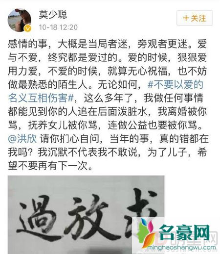 从本月的18号开始,香港艺人莫少聪接连两天在微博上为自己曾经的渣男形象开脱,他直接前女友@洪欣,斥责对方的人这么多年来不管自己做什么都要在自己身后对他进行攻击,,但是扪心自问,不管是儿子的事情还是当年的爱情没有走到尽头,真的都是自己的问题吗?以此来向外界证明自己并非大家所谓的渣男,而是为了儿子刻意隐瞒了一些事情,也不希望和洪欣有太多公开的互撕,但是现在是在受不了了,也希望洪欣能够适可而止让自己的生活回归平静。不过很显然,洪欣对此并不以为然,没有要接莫少聪炮火的意思,而是继续和现任张丹峰过属于他们的幸福生活。