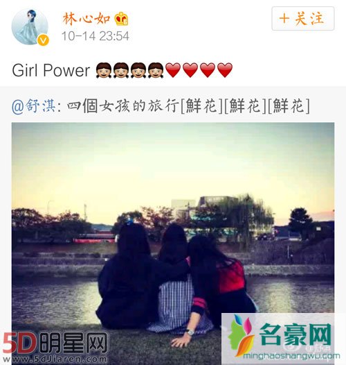 10月14日晚,舒淇在微博晒出和林心如、林熙蕾的背影图,并配文称:“四个女孩的旅行”,不过照片中明明是她们仨的合照,却被舒淇说是四个人,既然如此这是否证明怀孕中的林心如肚子里的这个孩子是女孩儿?诸如此类的猜猜瞬间席卷了网络,大家纷纷去林心如微博下留言询问,为其祝贺。