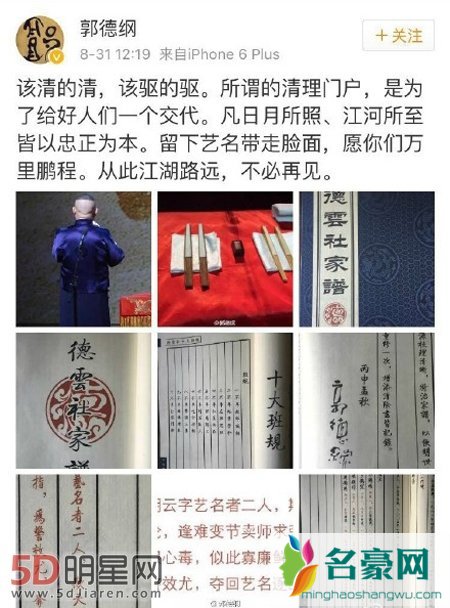 郭德纲创办的德云社到今年为止已经有二十年的时间了,从培养徒弟到一步步奋斗至今,德云社的繁荣昌盛离不开郭德纲的努力和坚持同时也离不开众弟子的倾情奉献。而自从德云社大火之后,其门下弟子也有一些相当走红的,人一旦得到的多了便有些其他的想法,于是在某一段时期,德云社也遭遇了史上最严重的一次人才流失。昨天郭德纲在整理德云社家谱的时候也再次声明曾有两位云字科徒弟由于欺师灭祖,遂夺回艺名逐出师门,疑似指曹云金、何云伟两位曾经的德云社得力干将。