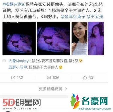 前两天宋喆和杨慧的离婚案正式开庭审理,由于宋喆申请了隐私保护所以该案不公开审理,媒体也是多方打探消息希望第一时间报道出相关事件。而万能的网友们就在昨天扒出来疑似马蓉床照曝光的视频和照片,并且声称杨慧家中安装摄像头拍丈夫出轨证据,刚好就拍到马蓉,究竟是不是真的还有待考证。
