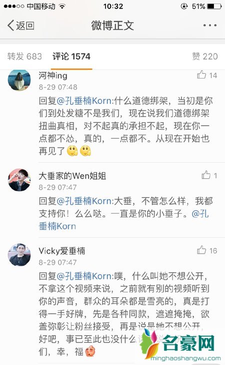 当初孔垂楠之所以走红就是因为2014年的一部《类似爱情》,影片中的孔垂楠和黄礼格两人饰演一对有着异样的男男爱情的一对,虽然不被外人祝福但是他们之间的感情却是令人动容的,因此才有了一批忠实的粉丝一直支持着他们。而这两年时间,一直各种暧昧给粉丝一种错觉的孔垂楠却在现在公开宣布了自己有女友,也就意味着他和黄礼格再也不可能了,打破了粉丝的幻想,自然是会让大家失望的。粉丝纷纷喊着脱粉的时候,孔垂楠显然也是招架不住,只说了一句“我从来也没有说过你们不好,以前不会,以后也不会,晚安吧”。