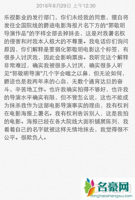 今天上午,郭敬明在微博上怒斥乐视影业将自己拍摄的电影《爵迹》的宣传海报上自己的导演名字擅自删除,和其工作人员沟通之后,对方表示是因为考虑到很多人讨厌郭敬明,所以希望可以降低损失。但是郭敬明表示,自己虽然知道很多人讨厌他,但是这部作品是自己历时这么长时间的心血,没日没夜的努力,即使作品没有达到所有人理想中的那么好,起码是自己复出所有所创造的,也是对自我的一种认可。现在把自己的导演名字删除,无异于否认了他所做的所有的努力,是对自己的极大不尊重,希望对方可以给自己一个说法。