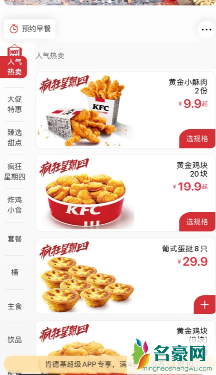肯德基疯狂星期四的优惠活动还是挺划算的,每周的活动都不一样,基本都是9.9元就可以吃到小吃,而疯狂星期四的梗也被大家玩的不亦乐乎,在疯狂星期四这天肯德基无论是官方小程序点外卖还是线下点单都是支持该优惠活动的哦!