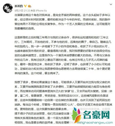 昨天晚上,张若昀写下了长长的一段微博,详细讲述了自己此次出演《霍去病》的整个心路历程。三年前就已经和父亲说好要靠着自己的实力出演一些作品,不想要拼爹,而经过自己的努力现在也积累了一定的经验,此次父亲找到他希望让他出演霍去病一角也是出于对角色的考虑,至于外界再度联想到他拼爹的传闻,似乎也是情有可原的。而张若昀也表示,自己无惧外界对自己的误解,这次自己而已考虑了很久,希望可以以一个相对成熟的演技以及满意的答复让观众看到他的成长,看到他不再是一个拼爹的星二代。