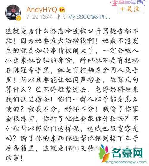 从昨天上午开始,黄奕的前夫黄毅清连番在微博上讽刺林志玲,并且其中一条还晒出林志玲与李嘉欣同台摆pose的照片,被指“又是拗造型又是故意拿手挡李嘉欣”“非常绿茶”,黄毅清甚至还在微博上直言:“要是我我也不愿意跟这种人交朋友。”对陈冠希骂林志玲事件也表明了自己支持陈冠希的态度。
