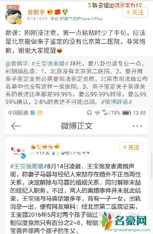 昨天凌晨事件曝光后,上午就有网友称看见王宝强带着孩子去医院做亲子鉴定了,但这种不靠谱的消息只是造谣的说法,有位微博名叫“曾鹏宇”的博主发声称:“北京能做亲子鉴定的没有北京第二医院,亲子鉴定关于亲缘关系的表述比率都是99.99%,要么排除,要么确认。”