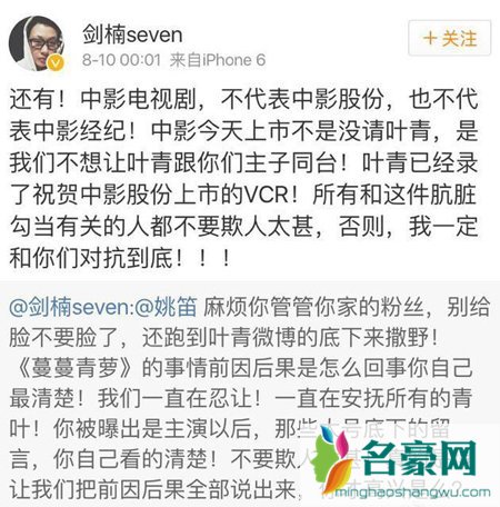 从昨晚开始,叶青和其经纪人在微博上隔空喊话演员姚笛并对其近期的行为进行了斥责,虽然叶青的话没有指名道姓只不过是发表了一番欲盖弥彰的对一部作品的看法而已,但是紧接着其经纪人的多条微博却显示,两人所指的都是同一个人姚笛。据悉,起因似乎是因为电视剧《蔓蔓青萝》的女主角原本定好了是叶青主演,这件事也得到公司领导和高层的认可和确认的,但是中途在没有任何预兆的情况下突然出来一个姚笛,顶替了叶青的女一位置,这件事也让叶青和其经纪人大为恼火。