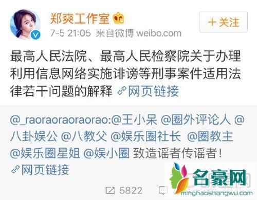 7月5日,微博叫做“王小呆”的博主在微博上爆料称:“太久没爆料了,随便说一个吧。郑爽现在和高晓松在一起,应该是今年3、4月份确定的恋爱关系。等有人拍到以后,欢迎随时来挖坟。”此消息一出迅速引发了诸多网友们的围观,虽然大多数观众并不相信爆料的真假,但由于造谣者已经严重损害了高晓松和郑爽的名誉,所以才会遭到当事人的双双起诉。