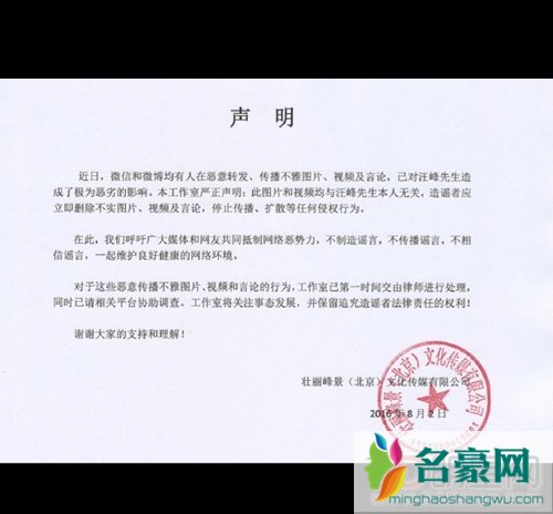 不雅照一事曝光后汪峰方面立即出面发表声明,称:“图片和视频均与本人无关”,同时要求造谣者立即删除这些不实言论信息,这种做法实属恶意造谣,毕竟就从照片中来看的话大家也并不能看出此女子就一定是学员徐歌阳,再者更是不能证明这段聊天记录中的人就是汪峰。