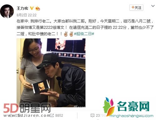8月2日晚22点22分,知名歌手王力宏发布微博称:“在家中, 我排行老二。大家也都叫我二哥。刚好,今天星期二,碰巧是八月二号,接着微博又是第2222条博文! 在这个充满二的日子里的 22:22分,当然也少不了二嫂,和肚中怀的老二!!”通过微博证实了其妻子怀二胎的消息。