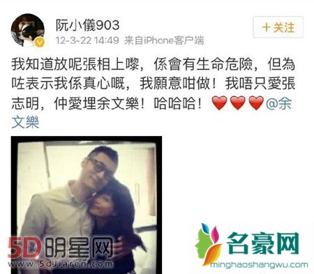 据悉,阮小仪是香港某电台主持人同时也是一名演员,曾经出演过《古灵精探》等港剧,虽然知名度不高,但是其为人还是相当受到认可的。而她和余文乐的这张合照其实并不是最近才有的,早在2012年阮小仪就发表微博示爱余文乐,不过只是因为当初余文乐出演的《春娇与志明》而已。两人年龄相差巨大,且丝毫没有过多的接触看,虽说是朋友但如果做情侣还真的是一个挺刺激的事情,而网友们得知此消息后,不管真假第一反应都是心疼周冬雨。想当初两人爱的那么真,没能在一起,这么快就传出六叔有新欢了周冬雨难道不心酸吗?