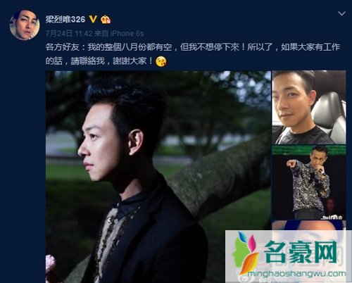 7月24日,香港艺人梁烈唯在微博上留言称“各方好友兄弟:有工作的话联络我!”微博发布后引起了不少人的关注,梁烈唯也被质疑是否出现了财务困难,面对各种各样的留言,被逼无奈之下梁烈唯才再度发了第二天微博,解释自己是因为档期问题整个八月份都有空,因为不想停下来所以希望大家有工作的话可以联络自己。