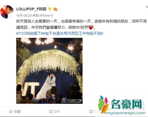 根据台湾媒体报道,全名叫做刘俊伟的前组合Lollipop棒棒堂的成员之一阿纬在22日东方文化举办的婚礼,至于和他结婚的对象是一位叫做钱文仪的富家千金,婚礼现场人缘好的阿纬不仅邀请到昔日棒棒堂的伙伴一同出席出席,蔡康永、修杰楷夫妇、制作人B2也都现身会场为他祝贺。