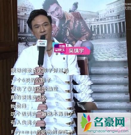 昨天吴镇宇在出席其主演的电影《土豪520》后接受了媒体的专访。在专访过程中心情非常不好的吴镇宇甚至做出了摔话筒的举动,他解释称因为费曼受伤造成了永久性伤害。吴镇宇同时指责湖南卫视欺负一个6岁的孩子,到现在都没有搞定保险。找了他们一年都没有人来承担这件事情,也没有人跟他沟通。