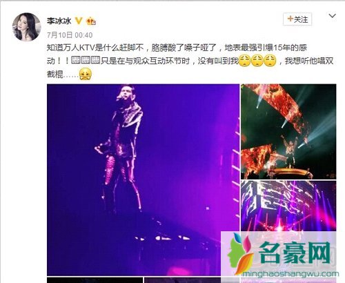 周杰伦地表最强世界巡回演唱会已经于7月1日上海正式开唱,7月8日至10日,周杰伦将会在北京乐视生态体育中心举办三场演唱会,如果仔细观察的话大家能从这三场演唱会中找到不少明星的身影,其中李冰冰和好友任泉就现身在观众席当中,李冰冰更是发微博表示:“知道万人KTV是什么赶脚不,胳膊酸了嗓子哑了,地表最强引爆15年的感动!!只是在与观众互动环节时,没有叫到我,我想听他唱双截棍……。”