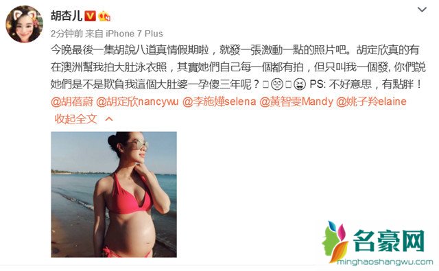 胡杏儿配文道:“发一张激动一点的照片吧,胡定欣真的有在澳洲帮我拍大肚泳衣照,其实她们自己每一个都有拍,但只叫我一个发, 你们说她们是不是欺负我这个大肚婆一孕傻三年呢?不好意思,有点胖!”