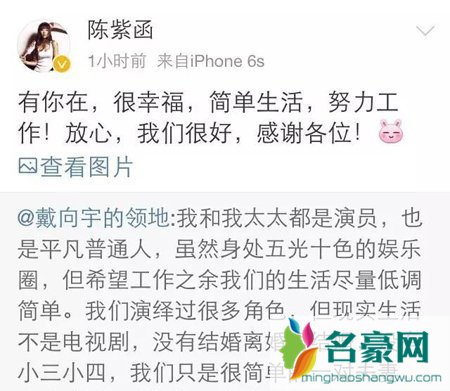 陈紫函在转发微博表示赞同老公的说法之际还不忘秀恩爱,晒出一张两人的牵手照向外界表明他们之间的感情是真挚的。我们不知道自称是戴向宇前妻的人身份是否准确,也不知道经纪人电话当中所说的事情是否经过剪辑,不过,既然陈紫函和戴向宇都已经结婚,而且夫妻双方也澄清并未有过婚史,那么一切以破坏他人家庭的行为和语言都应该适可而止。戴向宇和陈紫函也受到了广大网友的支持,希望他们能够坚定地继续幸福下去。