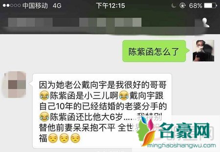 就在大家都还沉浸在为陈紫函高兴的时候,有一位自称是戴向宇朋友的人突然站出来向某知名博主爆料称自己和戴向宇以及戴向宇前妻陆怡璇都是朋友,H小姐说戴向宇和陆怡璇在2010年的时候就已经结婚了,后来陈紫函和戴向宇认识之后就被陈紫函给勾跑了,戴向宇和前妻离婚并和陈紫函在一起,自己因为替他前妻鸣不平所以才爆料的。并且还表示陈紫函比戴向宇大了六岁,此番爆料一出该博主专程向陆怡璇求证,但是通过聊天记录可以看到陆怡璇似乎并没有自主权,所以希望可以不要继续追问她而把一切问题抛给了经纪人和公司。