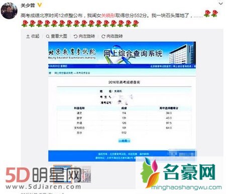 早在很多天之前,和张雪迎一样成长起来的童星关晓彤就已经晒出了自己的高考成绩单,从当初专业课考试以来以总分94.5的好成绩考取第一名就备受大家的期待,希望看到她文化课成绩也能够如此优秀。而就在高考结束不久,关晓彤和爸爸分别晒出自己的高考成绩单,总分552分震惊了众人,大家纷纷以膜拜学霸的感觉看着这个小姑娘。就在已经确定了一定被北影录取的情况下,凭借着私人关系,关少曾从北影校长处得知女儿关晓彤以专业课和文化课分别第一的成绩成为北影今年名副其实的第一简直不要太崇拜她啊。