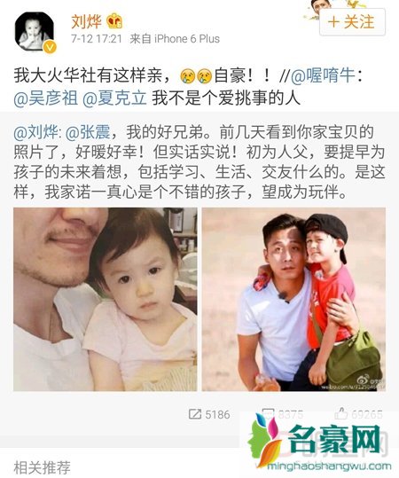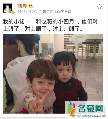 刘烨作为一个称职的爹真的是没话说,虽然之前在《爸爸去哪儿》的时候因为纸张的表现而总是被网友调侃是诺一带着自己的傻瓜爸爸一起出去玩,但是作为考虑到儿子的未来生活的话刘烨还真的是相当有头脑的。从儿子一出生就到处物色儿媳妇,于是就出现了几乎半个娱乐圈的明星子女们都被刘烨认作儿媳了。赵薇的女儿小四月,黄渤的女儿,姚晨在没有生出儿子之前,吴彦祖女儿以及在节目中青梅竹马的夏克立女儿夏天。所有人都在称赞刘烨这个全面撒网重点捕鱼的做法的时候昨天刘烨再出幺蛾子,竟然看上了张震的女儿,于是在微博上互动推销诺一有多么的好希望成为玩伴。