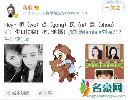 而在这些祝福当中,最引人瞩目的恐怕就是乔欣了,毕竟在欢乐颂中一个充当爸爸的角色一个担当妈妈的责任,这对CP早已经是观众心目中默认的最佳搭档。而生活中也是最好的朋友闺蜜的两人也在生日之际再次送给网友一大把狗粮,蒋欣不仅晒出两人的合照,而且还顺应民意的表示自己要做攻,要刘涛做受,最后还整出来两人的孩子,合成的孩子照片尽显可爱,也集中了两人的长相优点,让网友们看的合不拢嘴,并且在下边留言“今天涛姐生日,还是她做攻吧。”