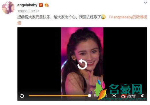 晚上十点多,Angelababy第一次发微博回应:“提前祝大家元旦快乐,给大家比个心,我回去练歌了。”
