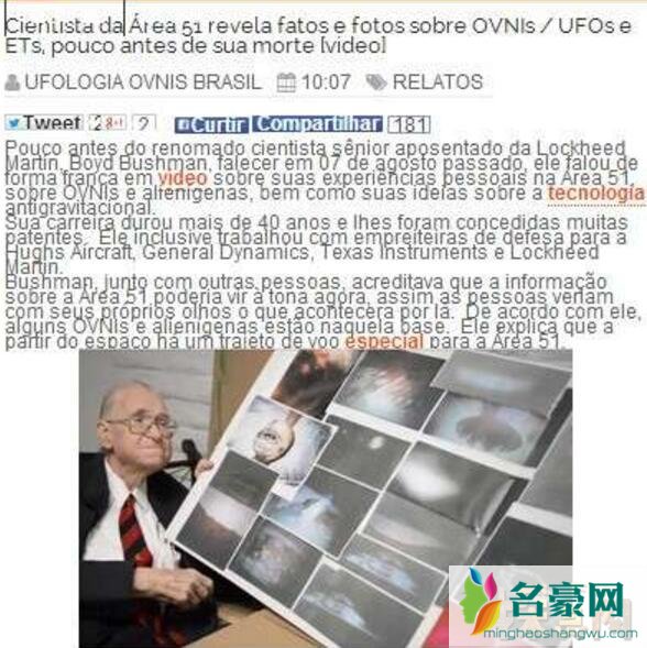 Boyd·Bushman布什曼是美国的洛克希德马丁公司的高级工程师兼科学家。他在自己临终之前找来了记者,将他所知道的美国51区曾关押着18名外星人这一事实给报告出来了!虽然这位德高望重的科学家虽然在中国很少人知道,但是在美国还是挺有威望的。所以基本上这一则消息很多人深信不疑!一时间科学家曝光51区外星人视频成了众人的探讨热点。