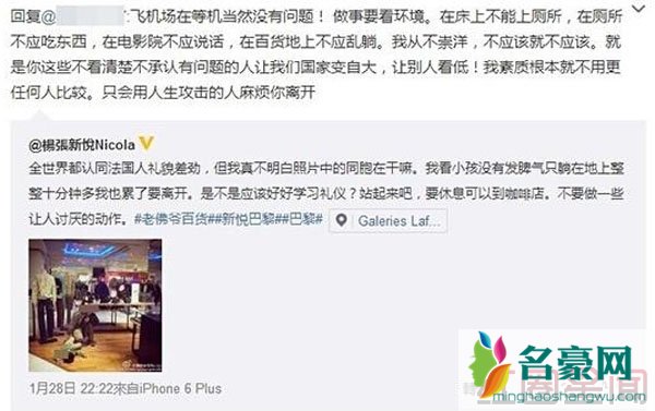 近日,香港女星杨张新悦的一条微博引发网友热议和反感,微博内容:“全世界都认同法国人礼貌差劲,但我真不明白照片中的同胞在干嘛。我看小孩没有发脾气只躺在地上整整十分钟多我也累了要离开。是不是应该好好学习礼仪?站起来吧,要休息可以到咖啡店。不要做一些让人讨厌的动作。”据悉,杨张新悦之所以会发这样的文字,是因为她在巴黎当地的一家百货公司看到一位内地小朋友躺在地板上一动不动,便拍下照片,上传微博炮轰内地儿童没礼仪。这种做法让网友们很是气愤,杨张新悦与网友的骂战也就此开始。