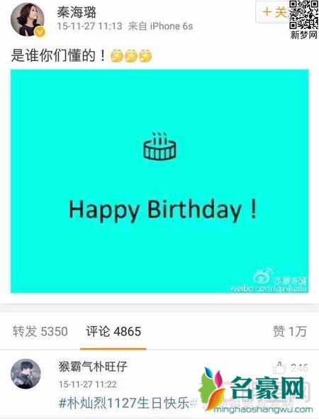 秦海璐微博祝朴灿烈生日快乐