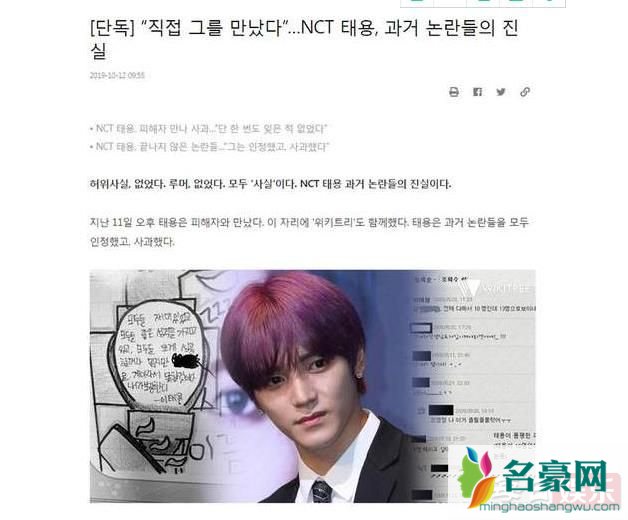 近日,SM旗下男团NCT127成员李泰容,就“校园暴力”事件向当事人道歉。2019年10月11日,李泰容在结束美国的日程抵达韩国后立即见到了受害者,这是两人长达10年以来的第一次面对面,李泰容向其低头道歉,承认了过去的错误,真诚地道歉。