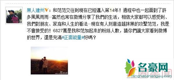 21日晚,黑人陈建州通过微博表示不能接受范范被黑,他写道:“和范范交往到现在已经进入第14年!过程中也一起面对了很多风风雨雨,当然也常在微博分享我们的生活,相信大家都可以感受到我们对朋友、家庭和人生的看法、、、、现在有人刻意造谣抹黑攻击范范,我是不会接受的!6827万是我和范范加起来的粉丝人数,请你们让大家看到微博的世界,还是充满正能量好吗?”表达了自己的态度和立场,同时也表示心疼范范,直言无法接受有人故意抹黑攻击范范。