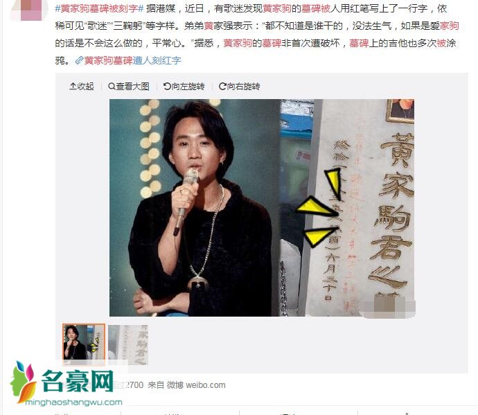 黄家驹的歌迷都是风雨无阻一定会在这天“探望”偶像,送出鲜花、纸鹤、可乐等祭品,可如今看到偶像的墓碑遭破坏,实在令人心寒。不过在纪念活动中,依然存在不少不理智的歌迷,在黄家驹的墓碑上刻字,虽然缅怀的情感可以理解,不过大可采用其他的纪念方式,墓碑上刻字实属不妥。