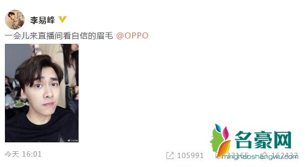 近日,李易峰在社交平台上更新了动态,李易峰晒出了一张自己的自拍照片,并且配文表示::“一会儿来直播间看自信的眉毛”。照片中,李易峰眉毛上扬,眼神清澈,帅气十足。