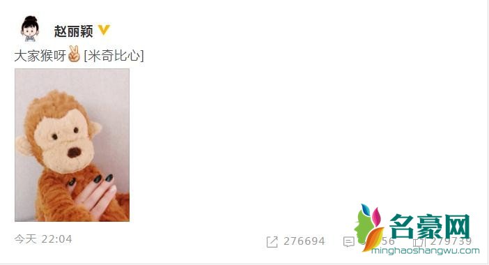 6月23日晚上,赵丽颖在微博上晒出了一张照片,并且调皮的配文道:“大家猴呀”并且后面还配上了一个剪刀手的表情,看来成为妈妈后的赵丽颖依旧是调皮可爱!
